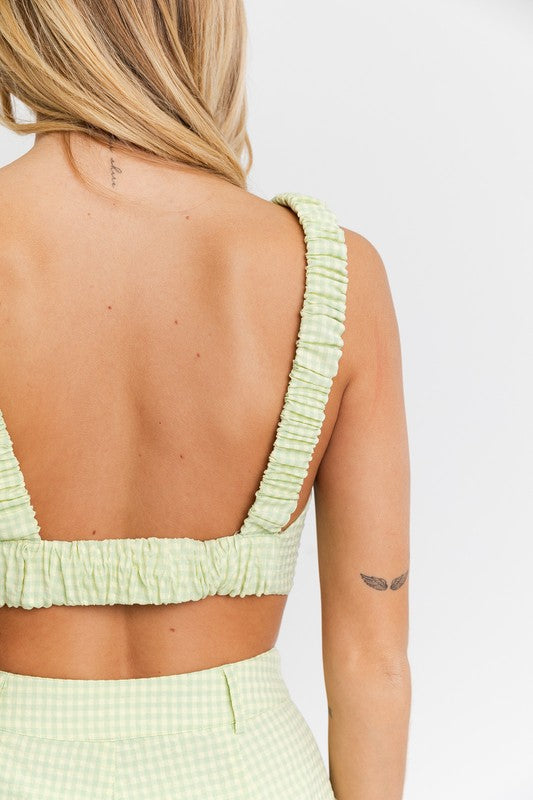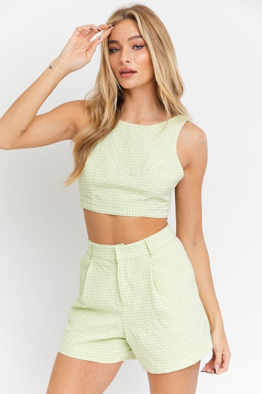 This top is SPRING! We love it with a cool pair of jeans, or with its matching shorts and blazer! The high neck, cropped open back tank adds just enough cool to any outfit!