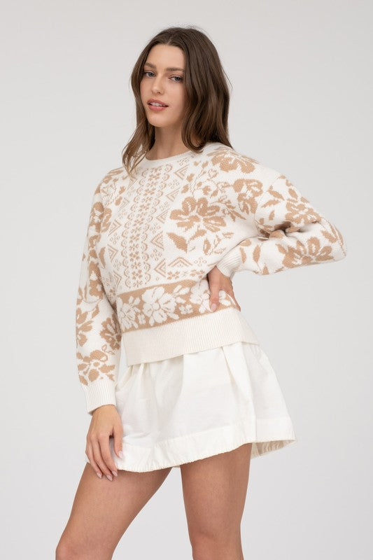 The most subdued tropical cozy sweater you ever did find! We love the print on this neutral sweater.