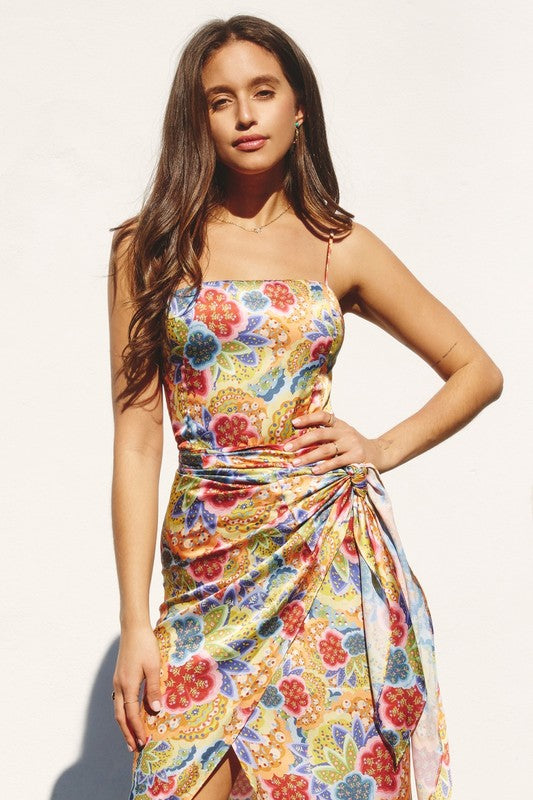 This top is seriously meant to be with the birdie wrap skirt! We love the tropical and colorful satin print to add some good vibes to just about any fit!