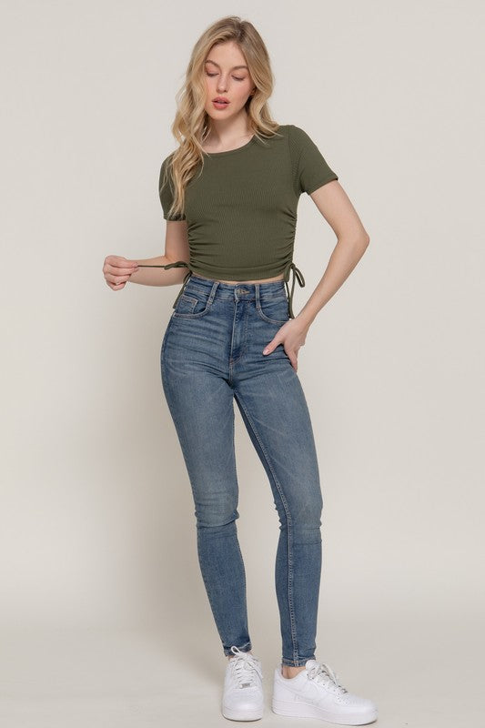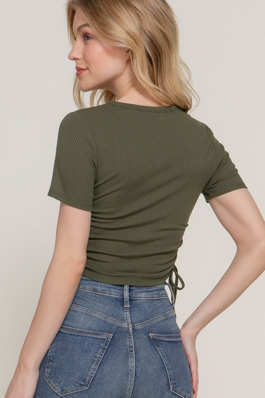 Need something a little step up from a basic? Try this side tie ruched top!
