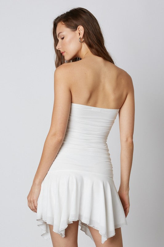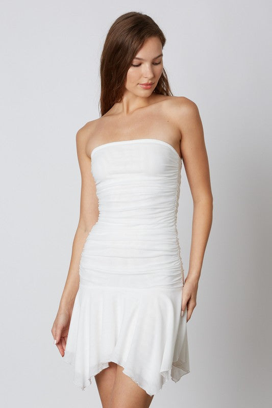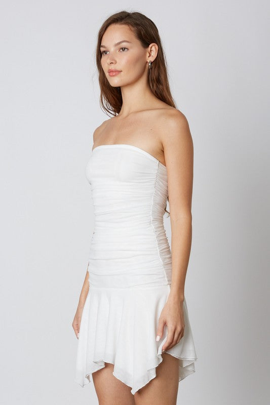 Perfect for brides or graduates! Features a ruched strapless bodice with a mesh overlay and asymmetrical hem.