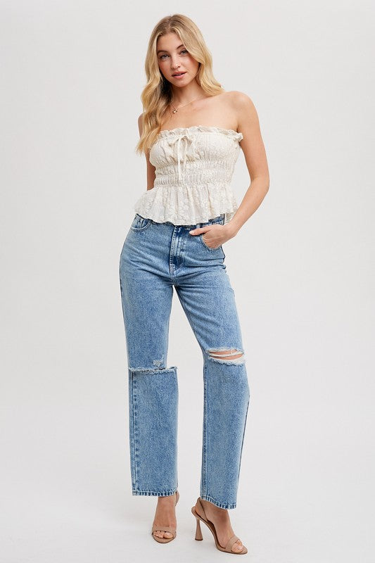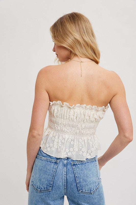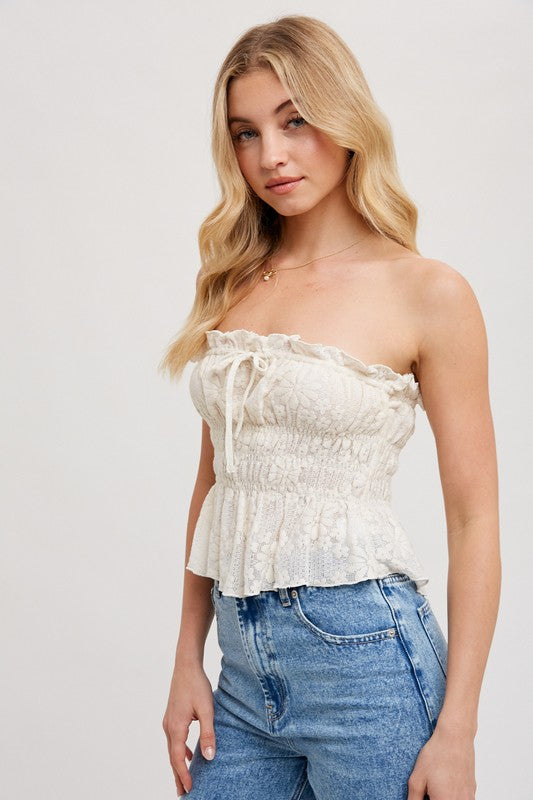 This adorable spring tube top features a tie in the front along with very dainty floral lace details. Pair with your favorite jeans, shorts or a midi skirt for a full on spring look!