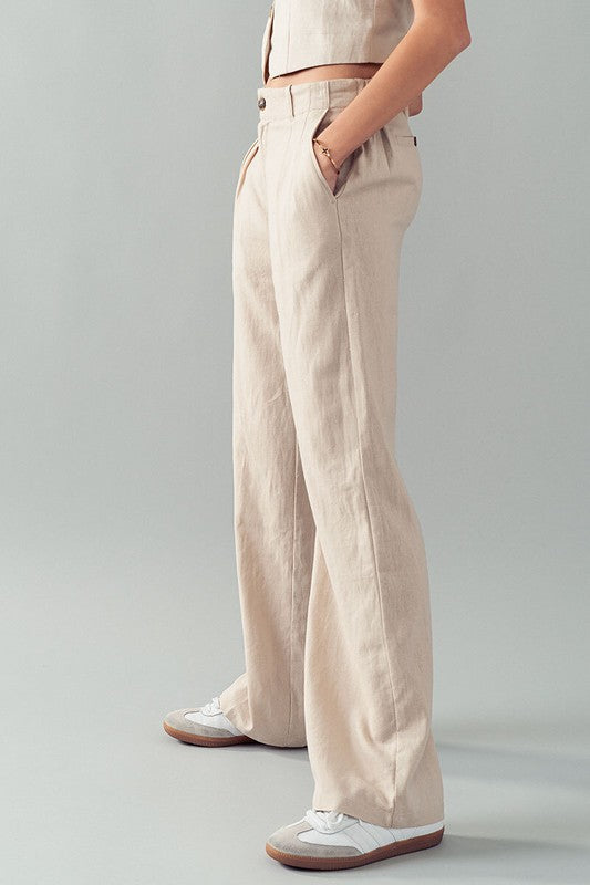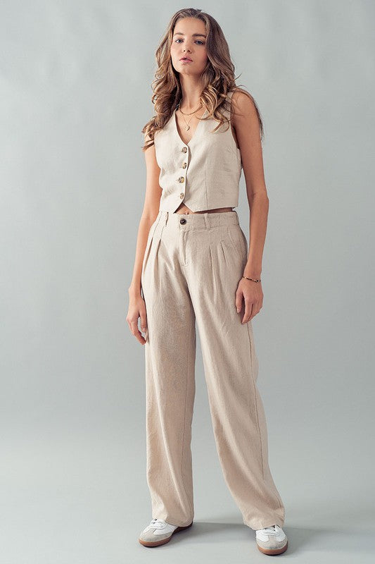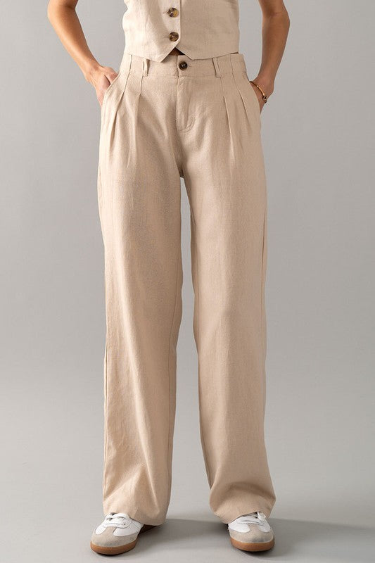The linen pants you need this spring. These linen pants feature a high waist and pleated wide leg bottoms. Pair with your favorite tee or the matching top!
