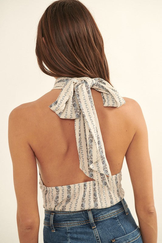 The comfiest halter top bodysuit for summertime! The blue and white print with the tie neck halter is perfect for that boat to beach summer vibe!