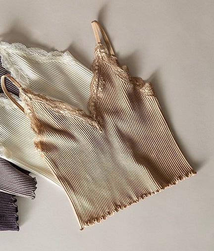 This cropped cami features a ribbed detailing and lace on the top as well as spaghetti straps. It’s an awesome basic!