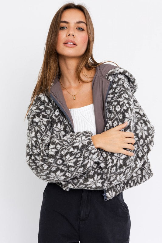 This cropped winter printed jacket is the coziest of all time! Add this teddy style jacket to any winter fit! The pockets and hood are sure to keep you warm!