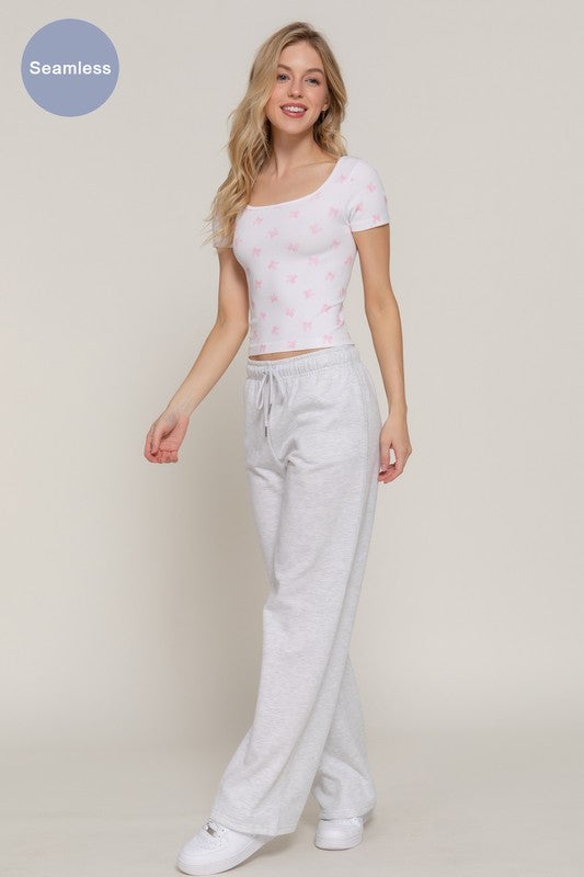 Trend alert! We love the little bow details on this basic short sleeve seamless top!