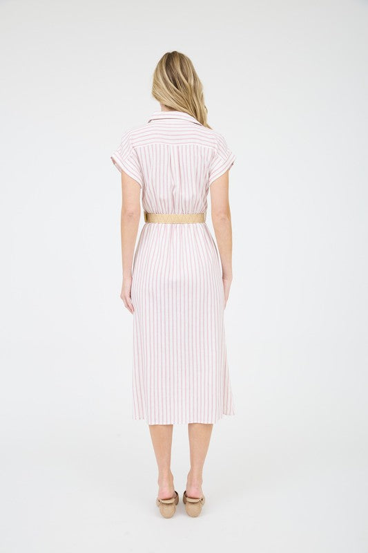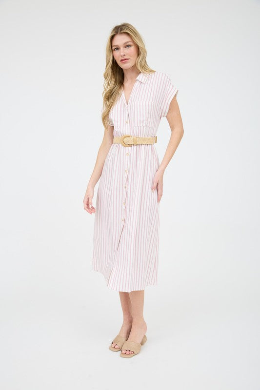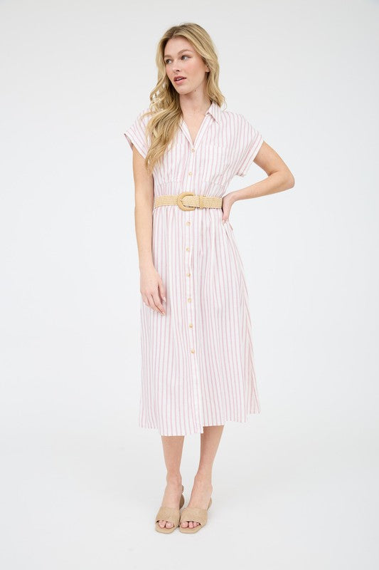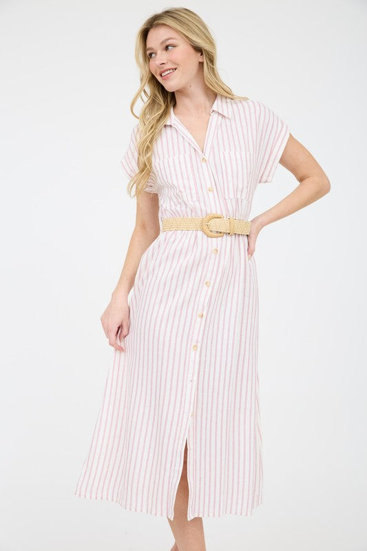 We love this button down striped linen blend dress! Perfect for a spring or summer day and super flattering with a belted waist!