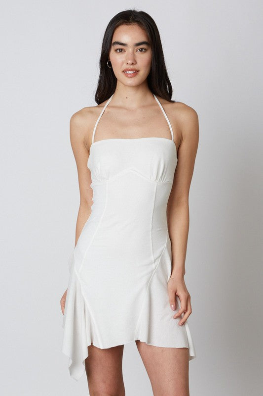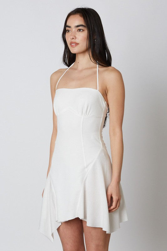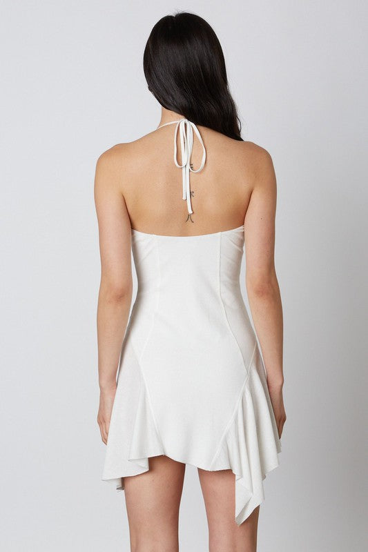 Perfect for brides or graduates! Features shimmer fabric with a tie halter top and asymmetrical hem.