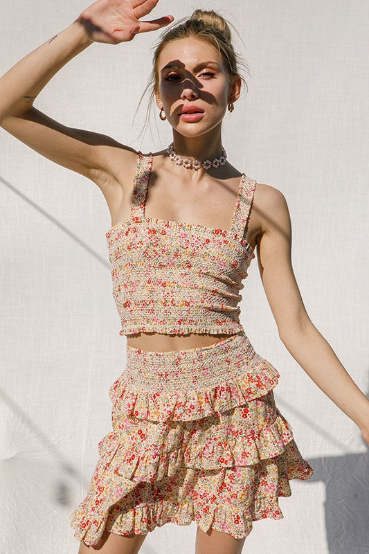 Ruched floral skirt and top set?! Sign us up! This super flattering ruffle skirt and top set can be worn to just about anything! Add boots and a cardigan for a simple fall look or wear with sandals!