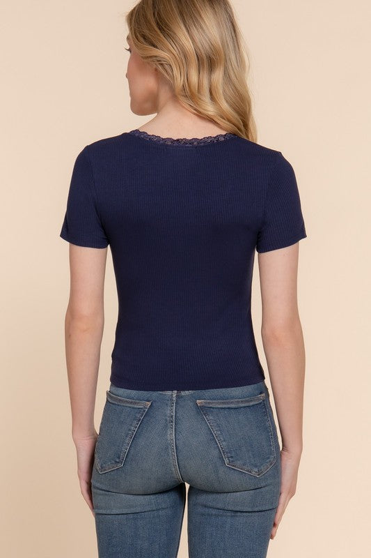 Need something a little step up from a basic? Try this short sleeve top—it has an adorable lace neckline!