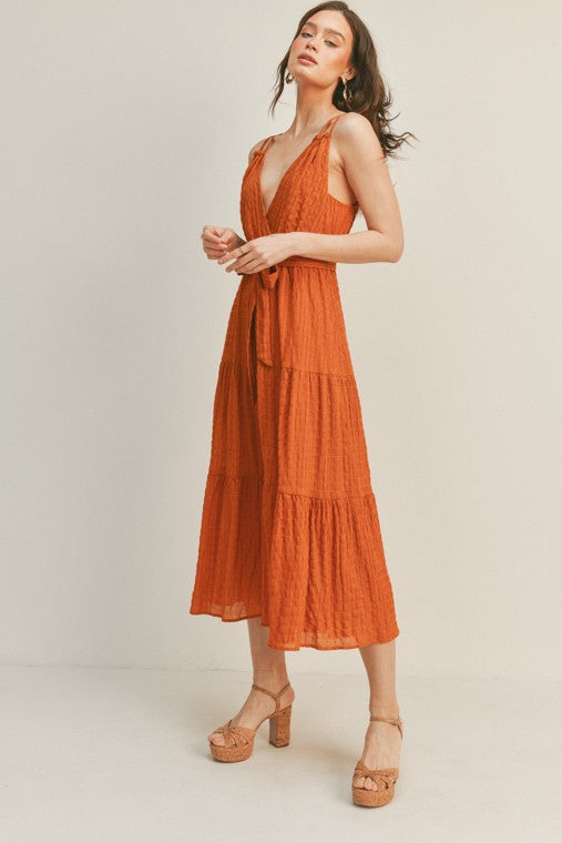 We cannot get over the rust color and cool texture of this maxi dress! The V neckline and belt make this summer dress beautiful for any event!
