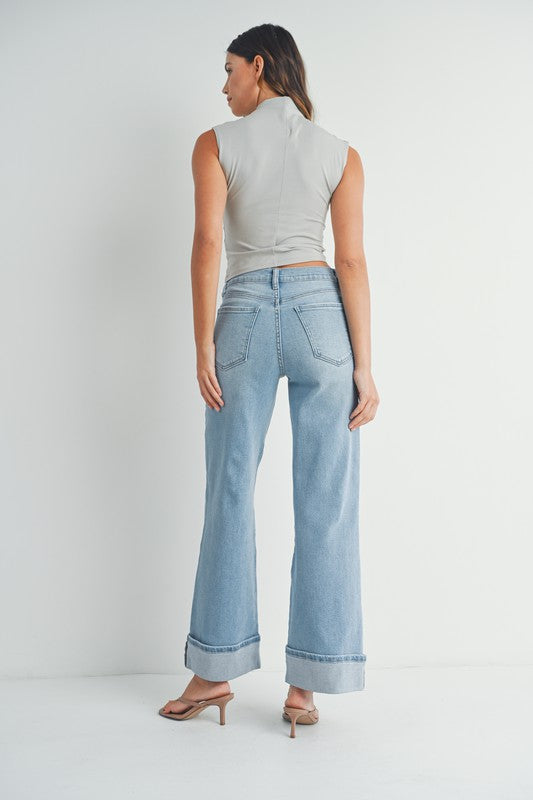 Mid Rise, Light washed, wide leg, cuffed denim jeans.